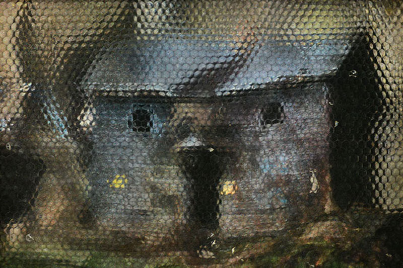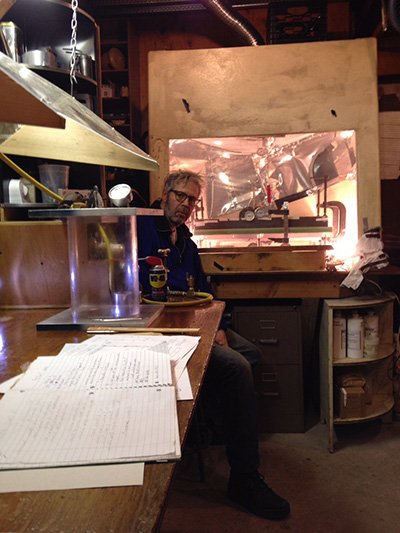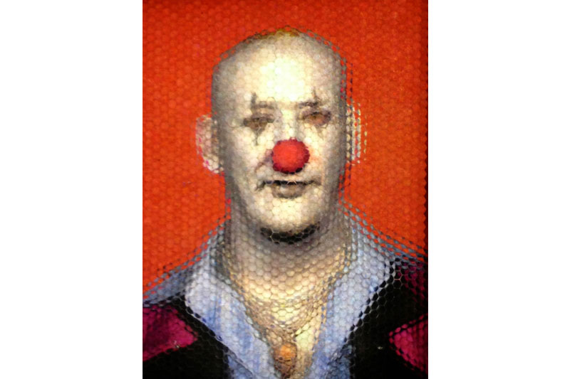 Here in Garnerville are early defining pieces, like Soul City, and such fruits of his more recent activity as 3-D portraits of Jim Jarmusch, Robert Frank, June Leaf, and Boonsri Dickinson who, back in Jones’s place on East 9th Street, introduced me to that techie supernova—both in intensity and duration—Google Glass. Here too are Jones’s giant wheels, which focus the eye on a single image. These are usually drawn by Jones himself in a cartoon-like manner which is wholly his own, and does not reference the increasingly mundane vocabulary of superhero graphics. The content can seem dark. On one of wheels a pig morphs into an alien, which turns into a girl, Molly, who turns into a duck, and so back into a pig.