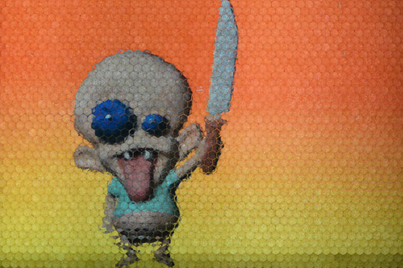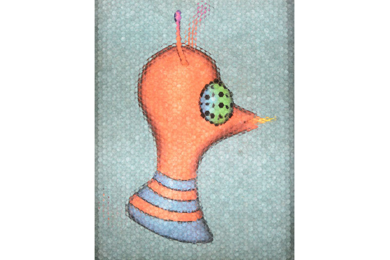 There are also sculptures cast in resin of favorite Jones characters, like Snakemonkey, and Slatherpuss, a creature he encountered in a long ago dream, name and all, and who has wings, protuberant eyes and an orange beak. Or Killer Baby, an animated sculpture he created on a stroboscopic zoetrope. This is a representation of an infant, wielding a knife, and apparently yowling, who is viewed on a black hooded screen. But the world of Henry Jones is not creepy. He is a sweet-natured fellow, indeed abnormally so, and his work doesn’t have that slight resonance of the sinister you can even pick up from most cartoony art, even Disney. What it does have is a combination of obsessiveness, sheer peculiarity and an appetite for work that suggests a touch of that over-used word, genius.