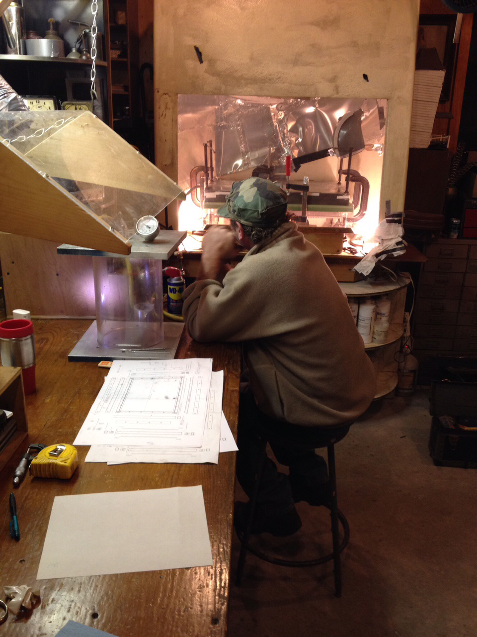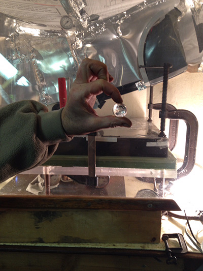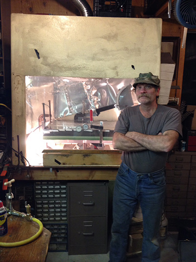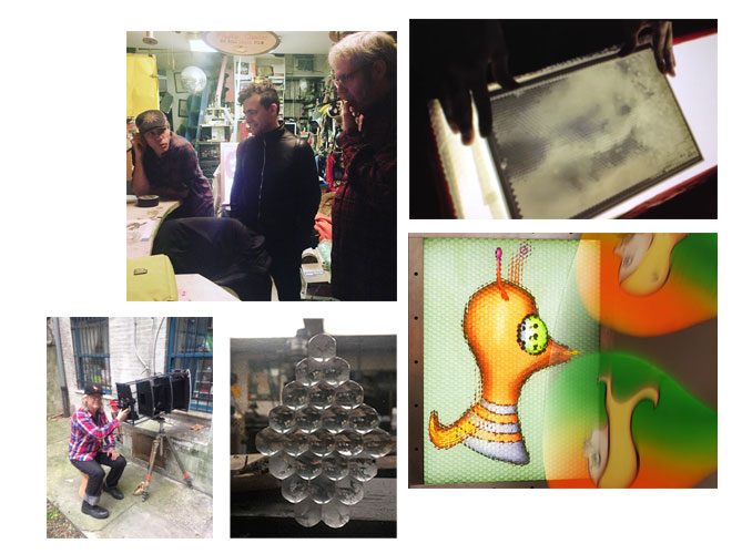 The upper floor of the 8,000 square-foot space is occupied by Pushing the Optical Envelope, the defining subtitle of Jones’s work. Jones—he is politely insistent on the M—is an artist/inventor/tinkerer in his 50s who grew up in Buffalo, and worked at Artpark, the outdoor arts festival, in his teens. Artists whose projects left a lasting imprint included Gordon Matta-Clark, who sheared a building into nine segments with a power saw, Laurie Anderson, dueting with a playback tape on an electric violin, and Dennis Oppenheim, who impressed giant thumbprints on a parking lot.